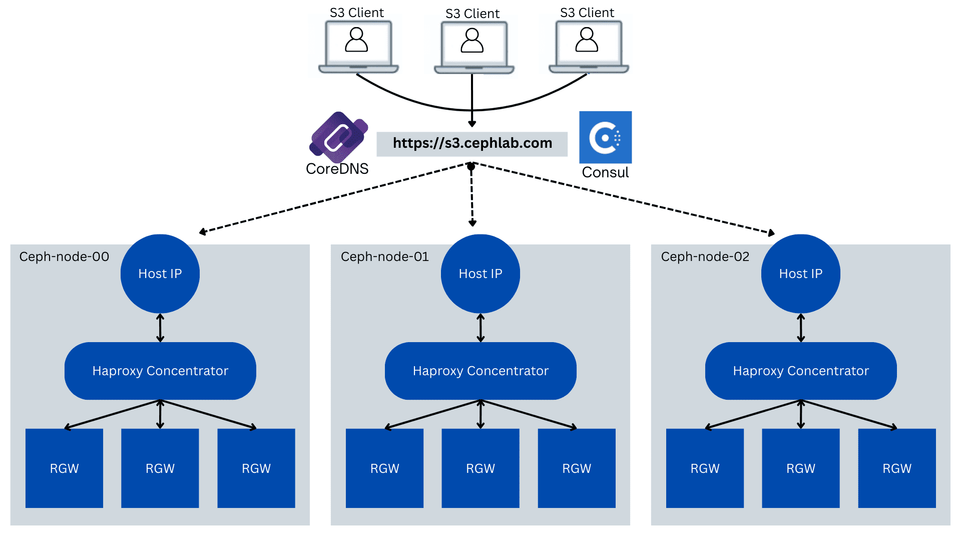 To scale efficiently and provide resilient S3 access, we need a distributed ingress model that can adapt to topology changes, automatically detect service health, and dynamically direct client requests. This is where the combination of Ceph ingress Concentrators, Consul, and CoreDNS provides a modern, flexible alternative.