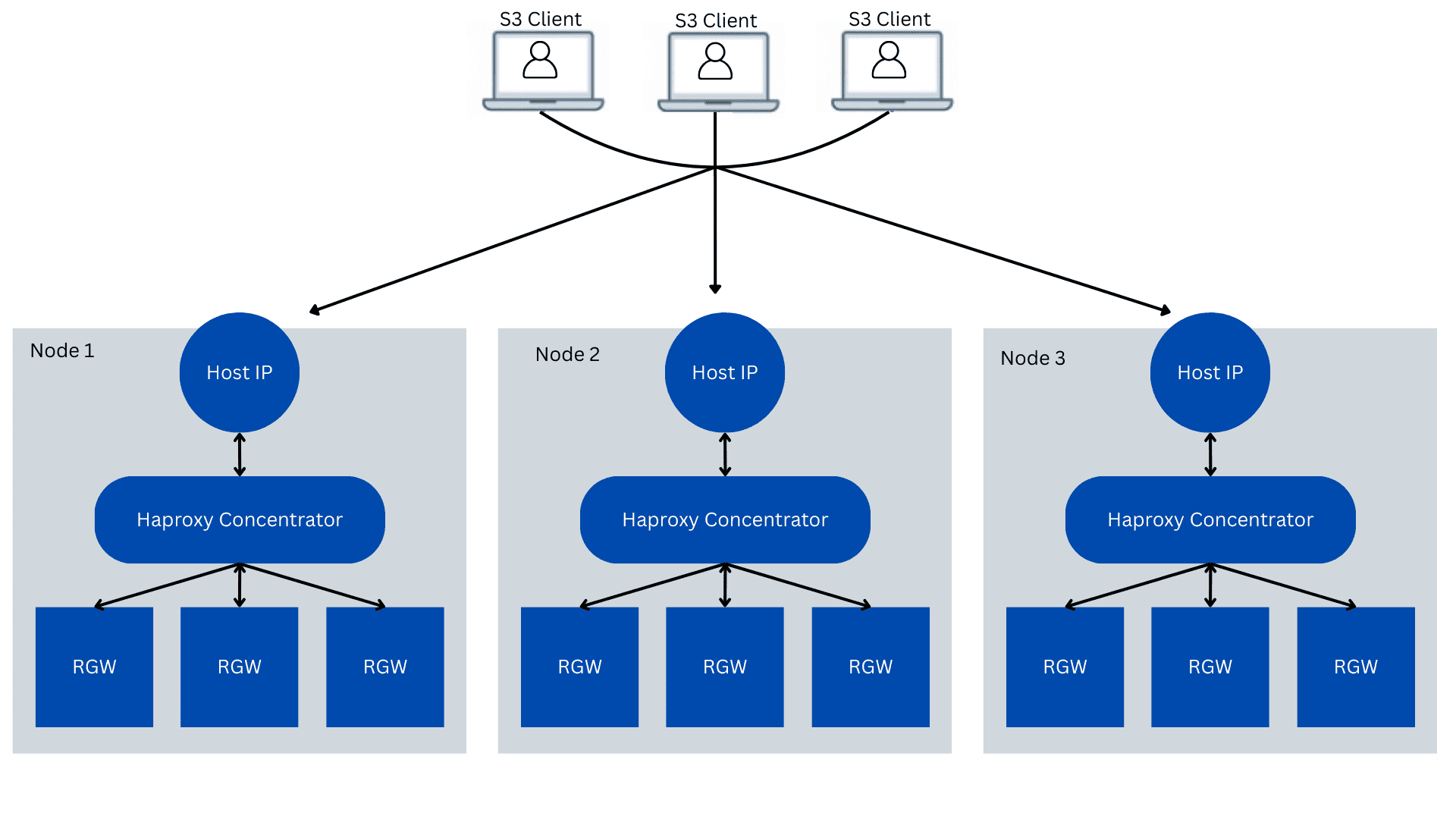 Ceph Tentacle will support concentrators, a new feature in cephadm that deploys per-node ingress concentrators. A concentrator is a local HAProxy instance that runs on each Ceph node and acts as a concentrator for the node's local RGW daemons. It provides a single IP:PORT endpoint per host and automatically balances traffic across the RGWs on that same node.