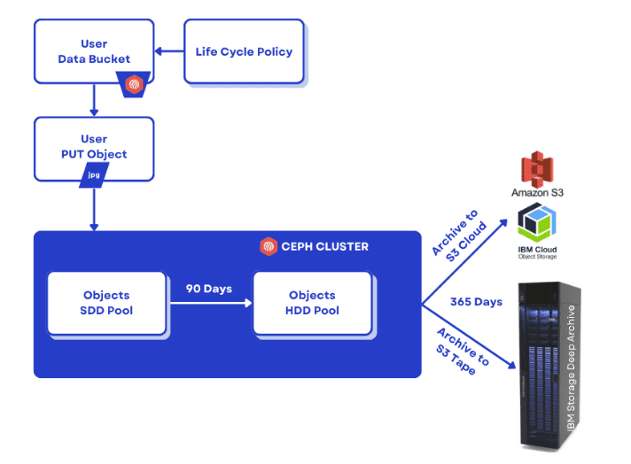 The Lifecycle (LC) Management engine automates data management based on user-defined policies applied to buckets. These policies consist of rules that trigger actions based on an object's age or other criteria. Everyday actions include Expiration, which deletes an object, and Transition, which moves an object to a different storage class. Lifecycle Transition can be defined between arbitrary storage classes (Tiers) within a cluster or to external S3 compatible endpoints, which include AWS, IBM Cloud or S3 Tape endpoints: