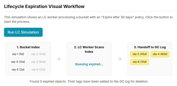 The LC engine is implemented as a set of multi-threaded worker processes. These workers periodically scan the bucket indexes across the cluster. For each object they encounter, they evaluate its properties against the bucket's lifecycle policy. If a rule's conditions are met, the corresponding action is executed. An Expiration action effectively triggers a standard delete, removing the object's index entry and enqueuing its data for GC. A Transition action involves copying the object's data to the target storage pool (which could be on a different media tier or even a remote cloud tier), and then updating the object's metadata to reflect its new location. To scale across large clusters, the LC engine's parallelism is tunable: