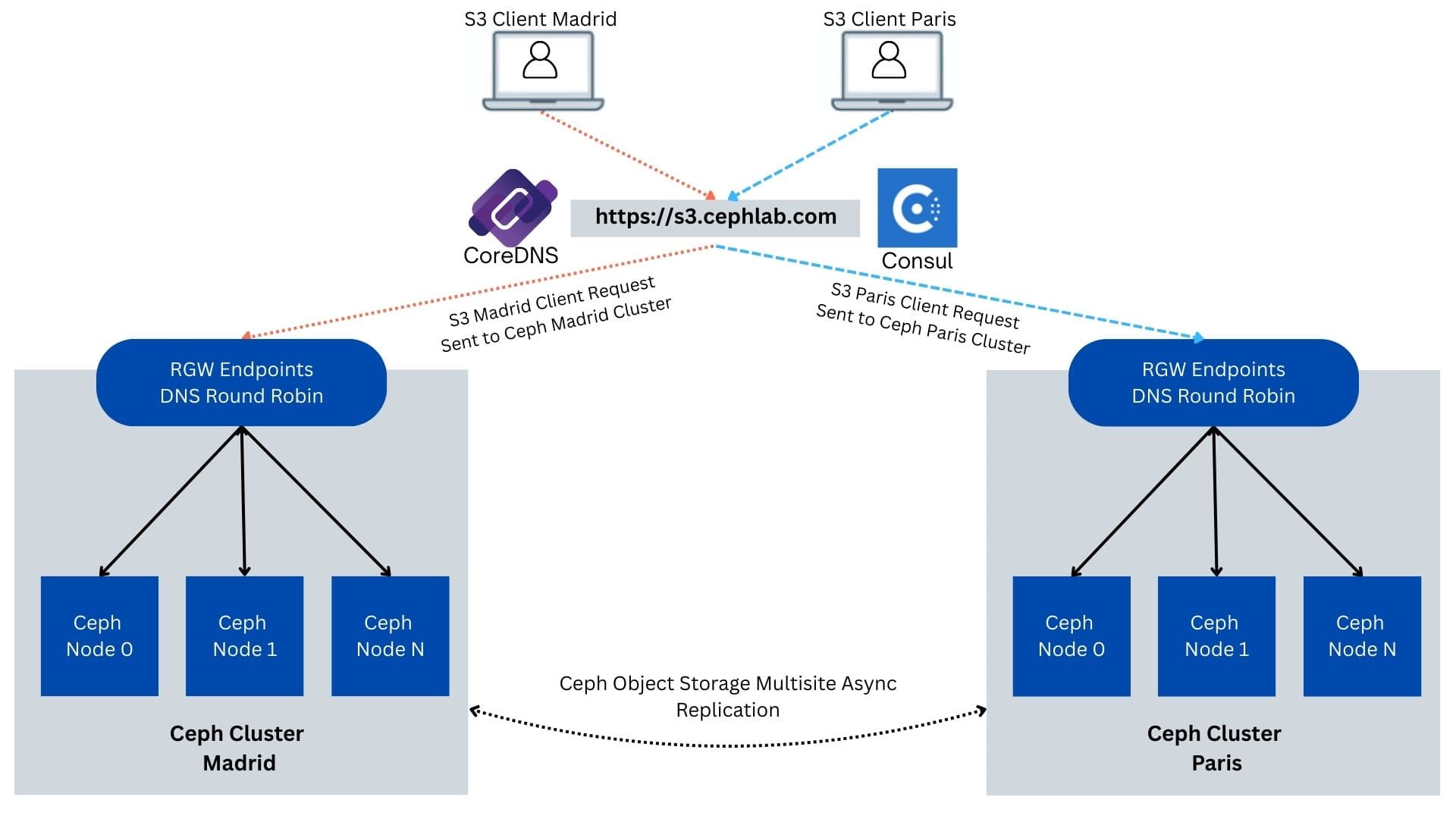 In Parts three and four, we combine Ceph Object Multisite (active/active data replication between Madrid and Paris Data Centers) with a Consul global load-balancing control plane, ensuring that the single S3 endpoint always routes to the closest healthy ingress and fails over across sites when needed, without requiring any client URL or SDK changes. Each site remains independent (its own control plane and Ceph cluster), while co-operating over the WAN so client requests always land on a healthy site.