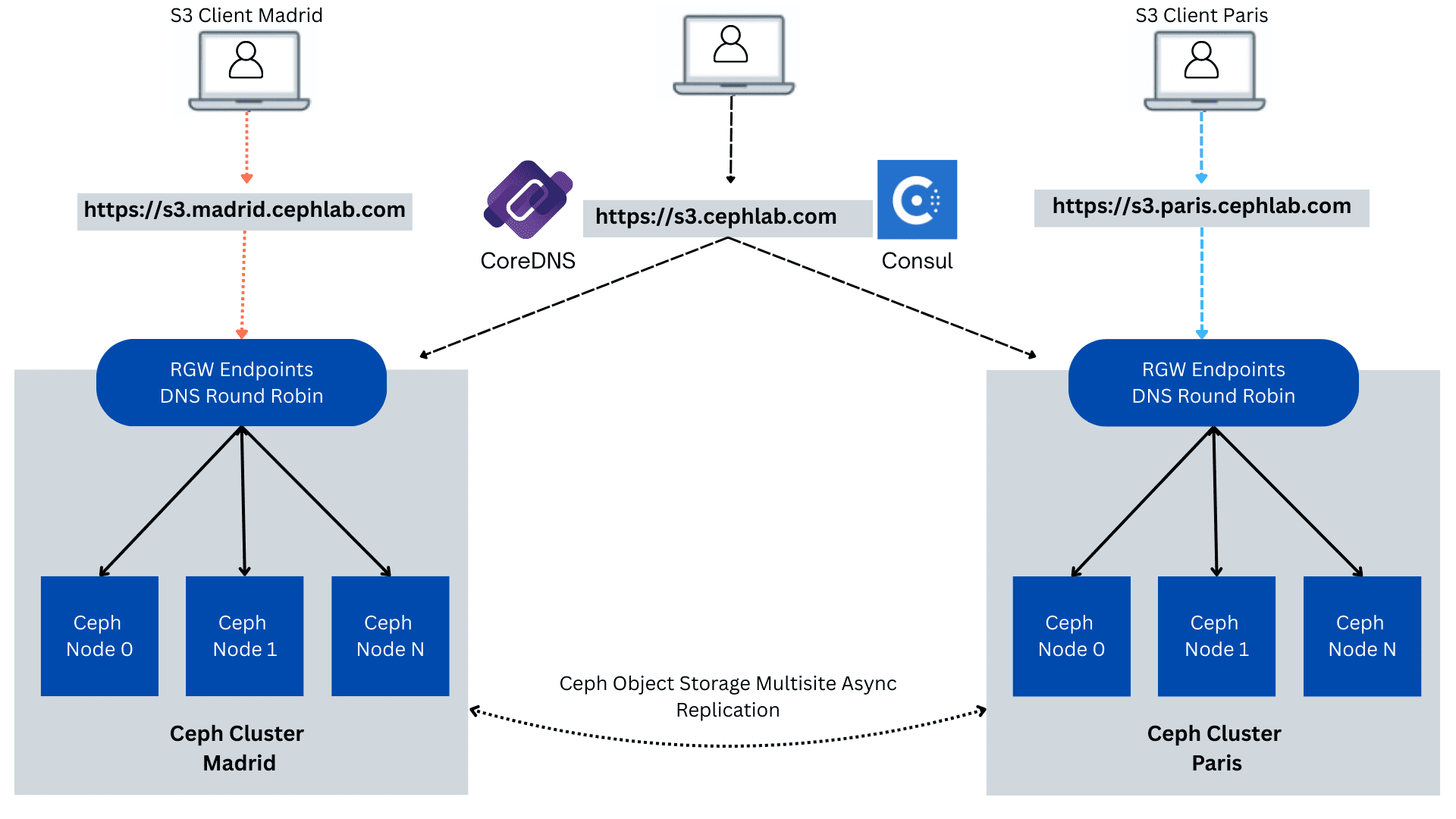 We also expose pinned per‑site names, such as s3.madrid.cephlab.com and s3.paris.cephlab.com, which forces the client request to one site or the other while still retaining failover if that site is unhealthy. This arrangement gives you resilient DNS across sites, locality by default, deterministic routing when you need it, straightforward latency/compliance testing, and seamless cross‑site failover driven by Consul health checks.