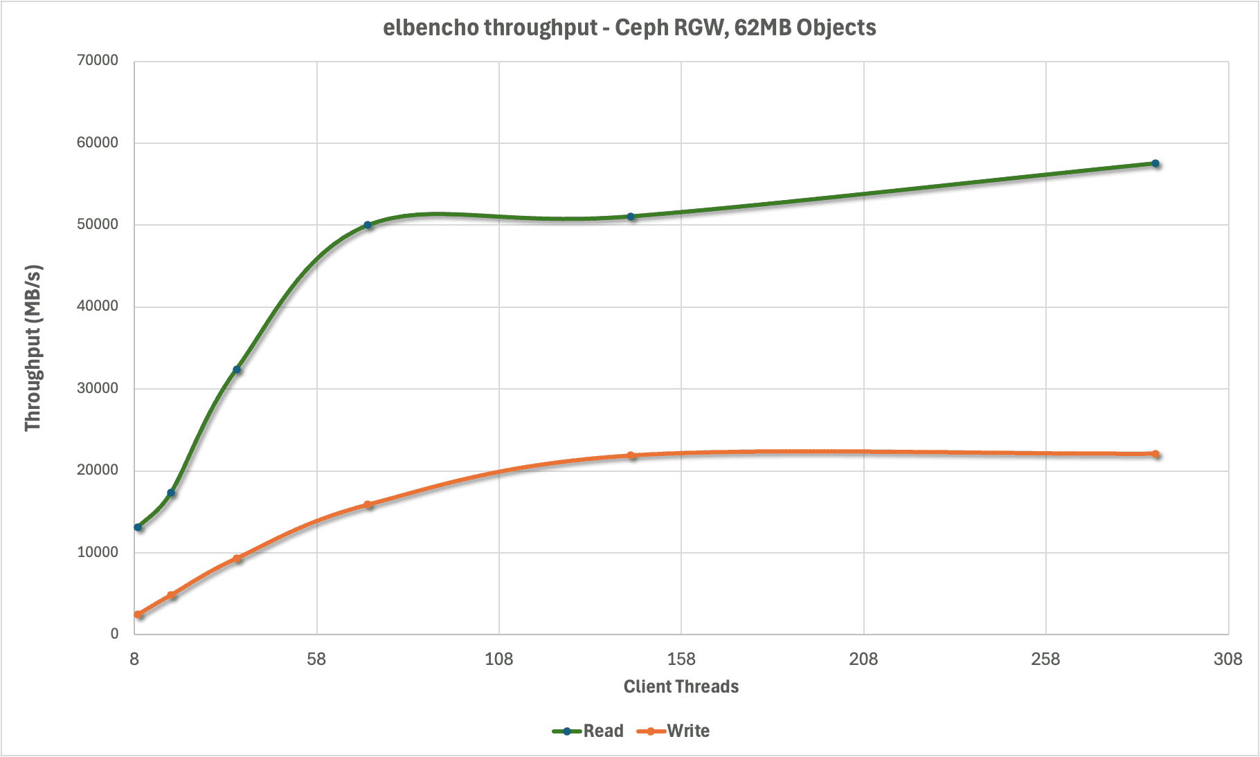 To establish the baseline performance of the storage cluster before we introduce vLLM and LMCache we assessed the performance using elbencho to generate load from the Gaudi3 GPU host and direct it towards the Ceph S3 endpoints. We used a 62MB block size to match the expected size of KV cache blocks being persisted by LMCache. This shows that we’re able to multiplex connections across the concentrator endpoints on each host and drive a considerable amount of S3 traffic from even a single host, topping out at nearly 60 GB/s.