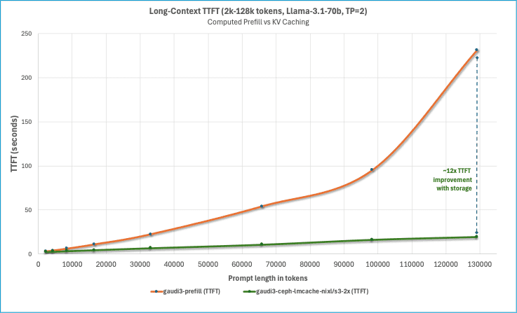 By restarting vLLM in step 3 we ensure that the results are not skewed by KV caching in GPU HBM or CPU memory, and by stopping vLLM and removing cache blocks from remote storage we ensure that each subsequent context length is not benefitting from remote storage KV caching from the previous context length. With this methodology all KV caches are cold at the beginning of each test, except for remote storage KV caching which we want to measure the benefit of in step 4.